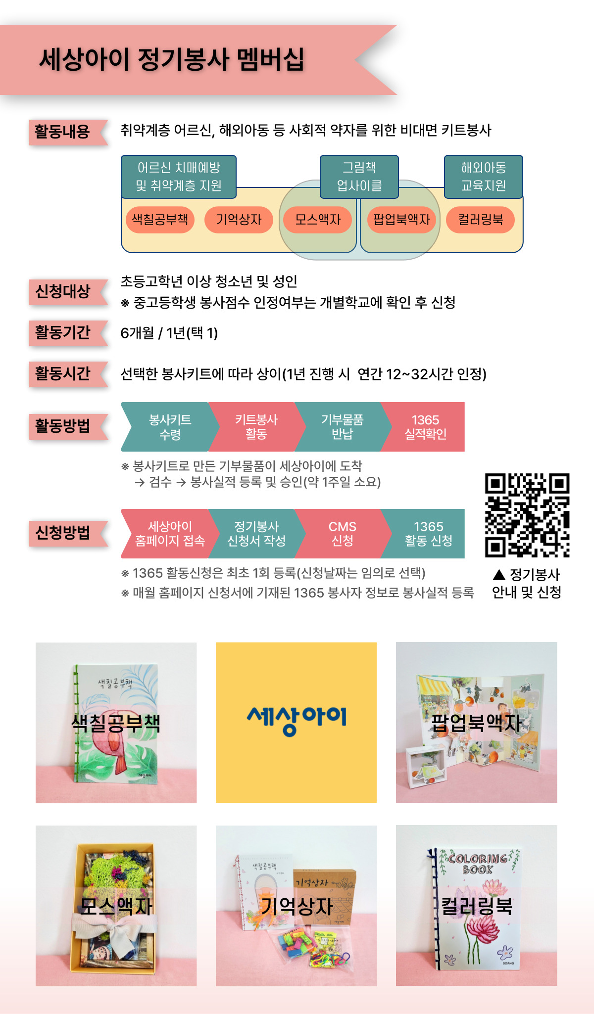 ★전화상담 불가/ 세상아이 홈페이지(sesangi.org) '정기봉사 멤버십 안내 및 신청'에서 자세한 내용을 확인하실 수 있습니다.